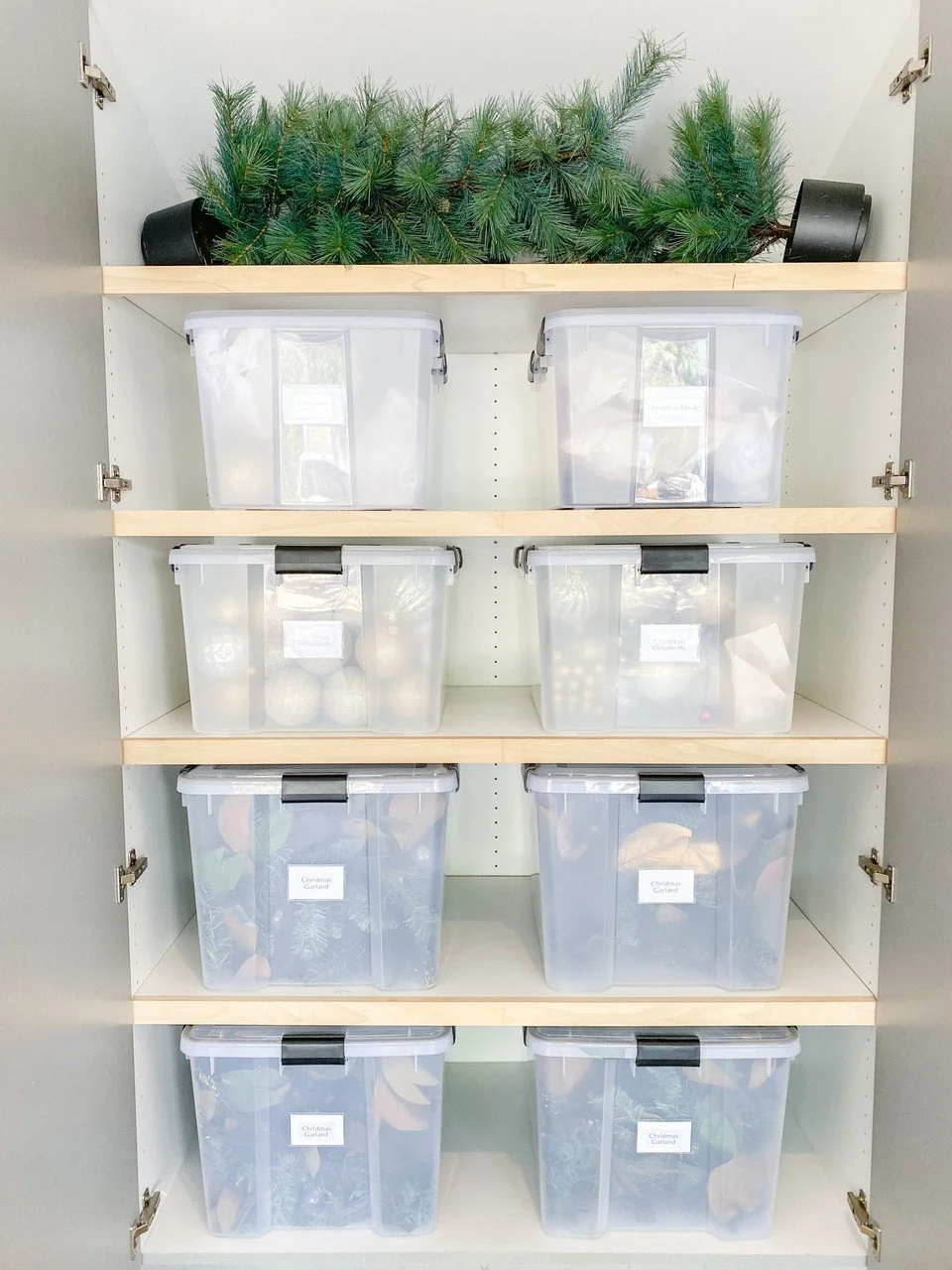 All remaining items, like stockings, table cloths, and nutcrackers can be stored in stackable bins of your choosing. I love something simple like these modular bins. They vary in size so you can easily separate each item and don’t forget to label everything (are you sick of me saying this yet)!